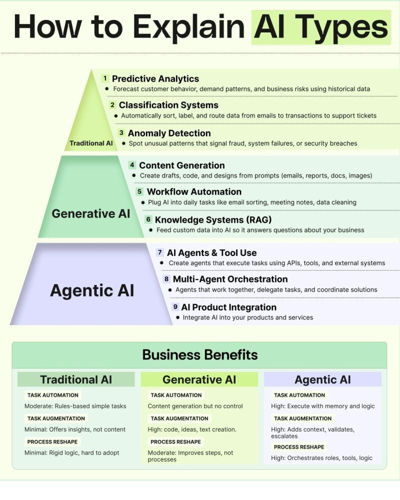 𝗧𝗿𝗮𝗱𝗶𝘁𝗶𝗼𝗻𝗮𝗹 𝗔𝗜, 𝗚𝗲𝗻𝗲𝗿𝗮𝘁𝗶𝘃𝗲 𝗔𝗜, and 𝗔𝗴𝗲𝗻𝘁𝗶𝗰 𝗔𝗜